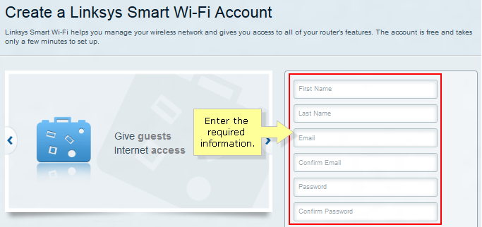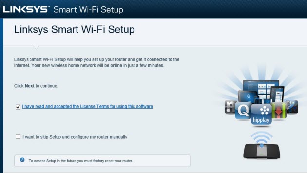 Pour la configuration, c’est autre chose… Une fois le bien connu 192.168.1.1 tapé dans la barre d’adresse du browser, je me retrouve dirigé vers http://linksyssmartwifi.com. Il s’agit de la platforme cloud de Linksys pour permettre un accès remote au routeur. Pour en bénéficier, il faut passer par un enregistrement avec une adresse email valide.